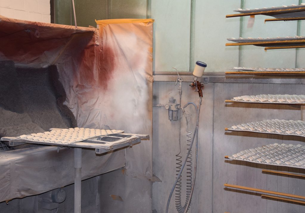 Des Weiteren steht ein Flächenspritzer für die Lackierung von Großserien zur Verfügung. Hier können Kleinteile mit einer Stückzahl von bis zu 40.000 Stück pro Woche lackiert werden.